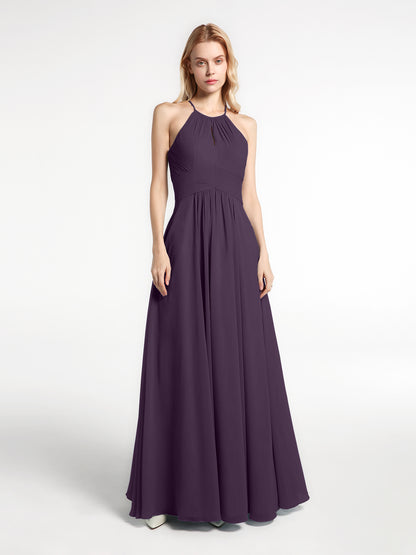 Halter Keyhole Neck Chiffon Dress with Pockets-Plum