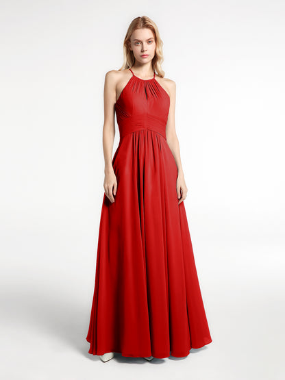 Halter Keyhole Neck Chiffon Dress with Pockets-Red