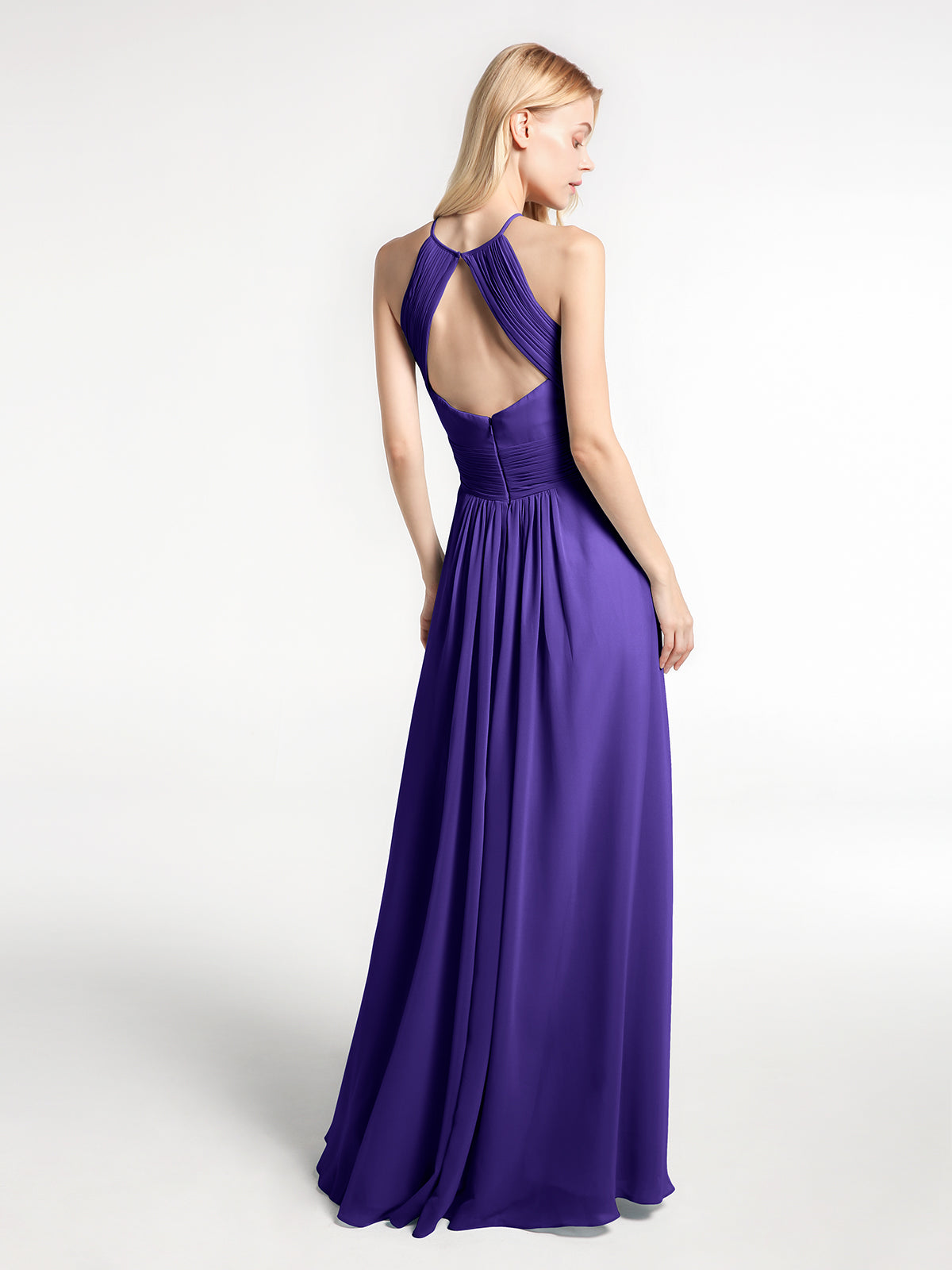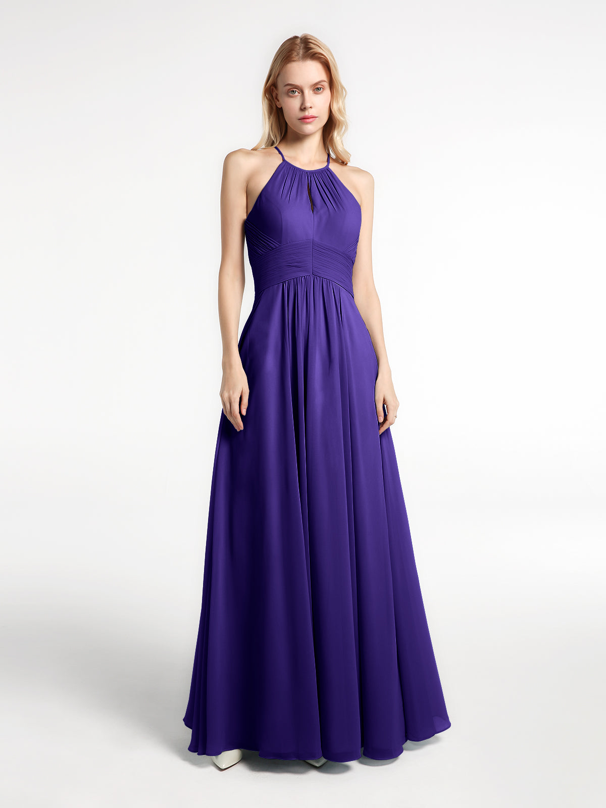 • Vibrant sheer chiffon forms a flowing, full-length A-line gown with a tasteful halter design for a figure-flattering effect.