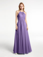 • Vibrant sheer chiffon forms a flowing, full-length A-line gown with a tasteful halter design for a figure-flattering effect.