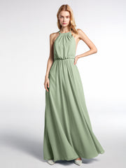 Halter Neck Low Back Chiffon Maxi Sexy Dress-Dusty Sage