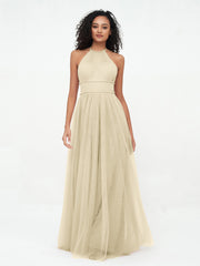 Illusion Halter Tulle Maxi Boho Dresses-Champagne