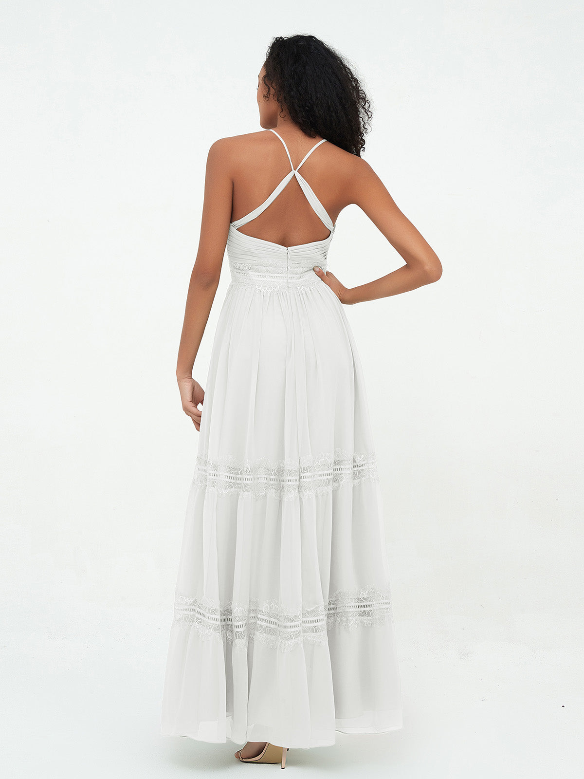 Lace and Chiffon Tiered Skirt Boho Dresses-Ivory
