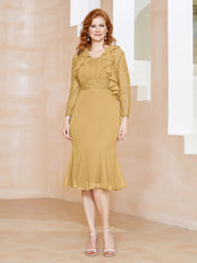 Lace Ruffles Tea-length Dress with Sequins Gold
