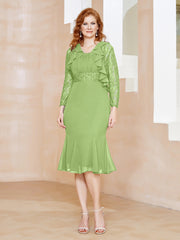 Lace Ruffles Tea-length Dress with Sequins Sage