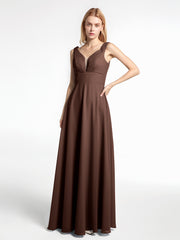 Notch Neck Chiffon Simple Full Length Dress-Chocolate