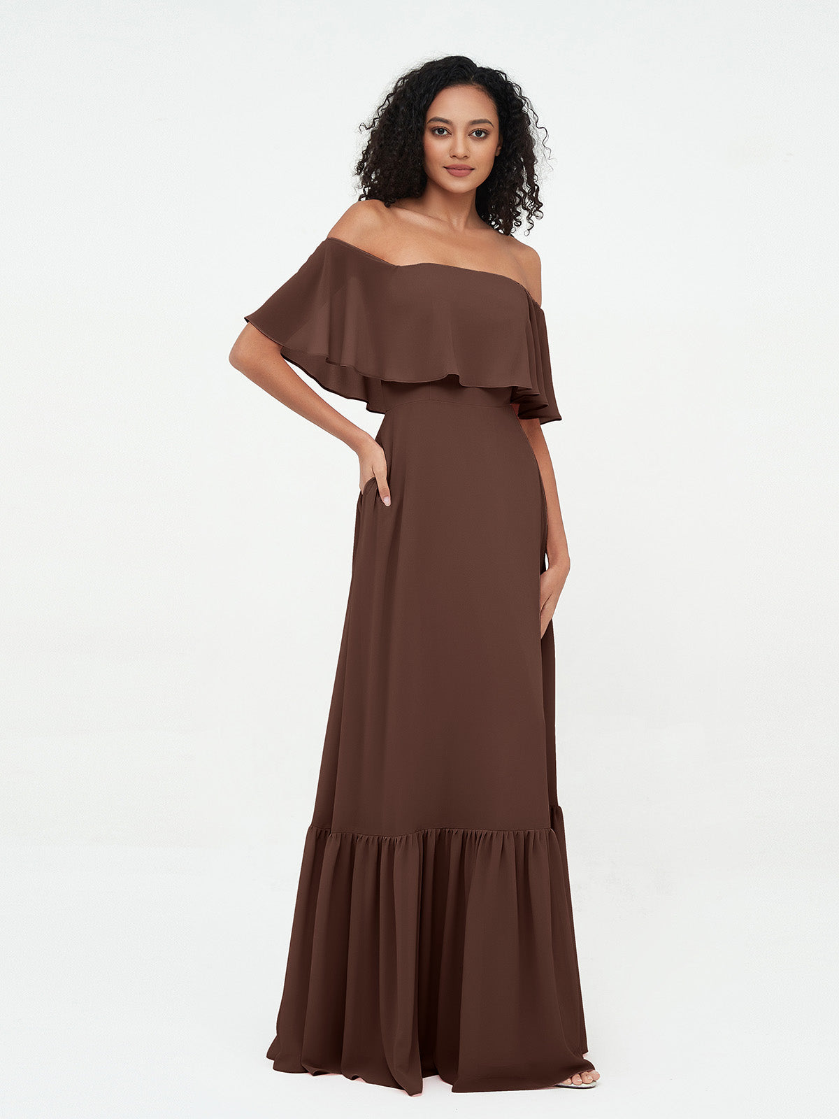 Off Shoulder Chiffon Tiered Skirt Max Dresses-Chocolate