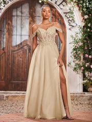 Off-The-Shoulder Beaded Appliqued Maxi Dresses with Slit Champagne