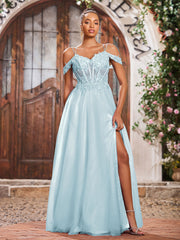 Off-The-Shoulder Beaded Appliqued Maxi Dresses with Slit Mist