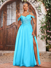 Off-The-Shoulder Beaded Appliqued Maxi Dresses with Slit Pool