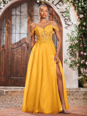 Off-The-Shoulder Beaded Appliqued Maxi Dresses with Slit Tangerine