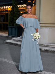 Off the Shoulder Ruffles Chiffon Maxi Dress-Dusty Blue