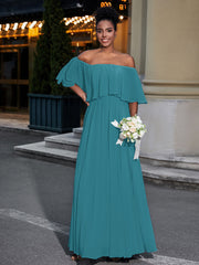 Off the Shoulder Ruffles Chiffon Maxi Dress-Jade