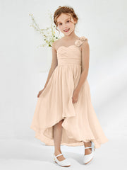 One Flower Shoulder Asymmetrical Junior Bridesmaid Dresses Peach