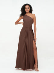 One-Shoulder Chiffon Max Dresses with Slit-Chocolate