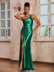 • The One-Shoulder Pleated Stretch Satin Dress features a striking asymmetrical neckline with elegant pleating and a smooth stretch satin fabric, combining modern sophistication with classic allure.