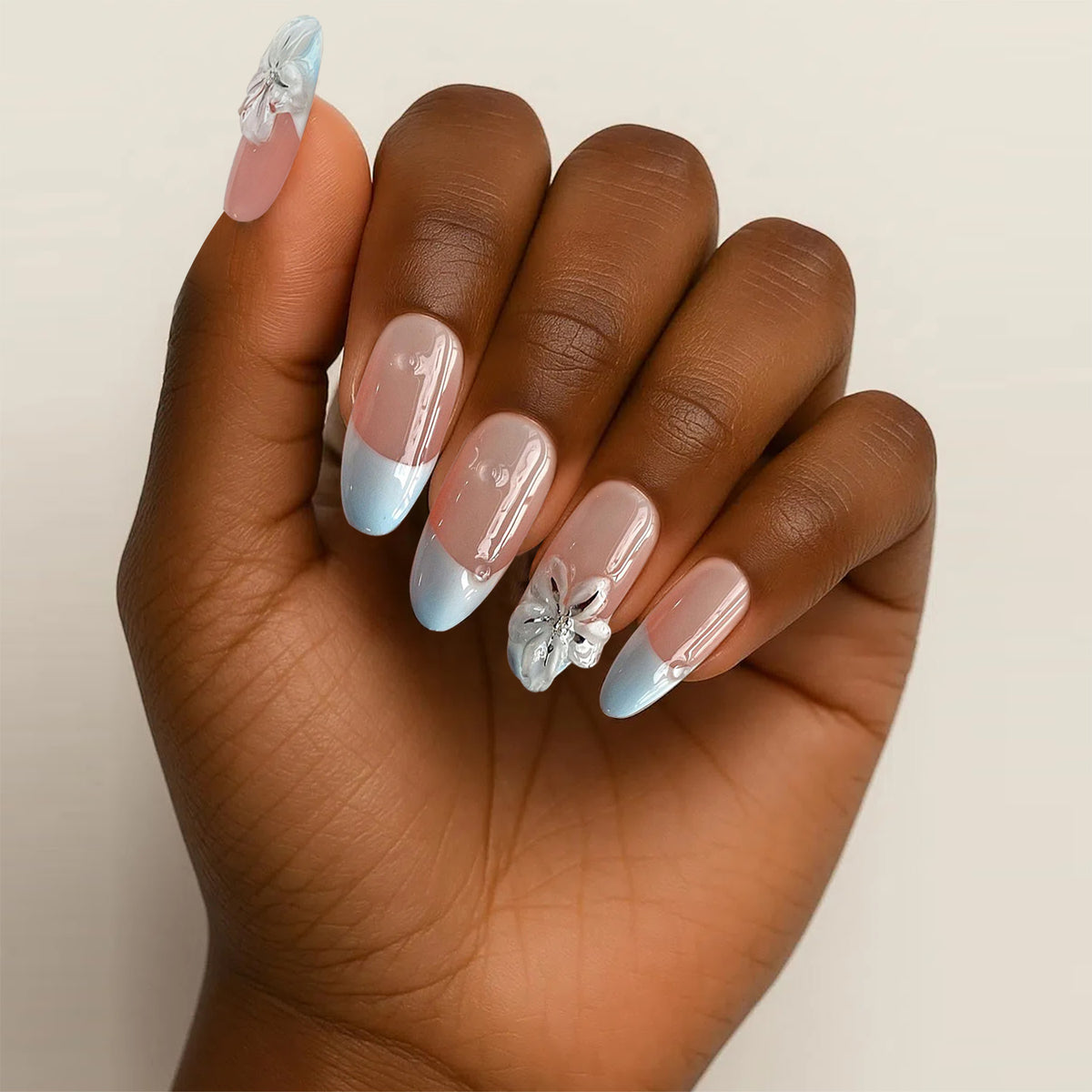 This look features a classic French tip design with a soft, pastel blue polish. The nails are adorned with delicate, clear 3D flowers with silver rhinestone centers, adding a touch of sophisticated artistry.