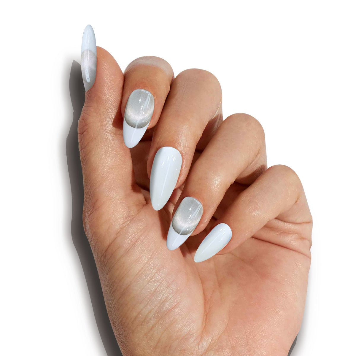 A modern twist on the classic French manicure with a deep white tip. The sheer silver-grey cat-eye creates a glowing, magnetic effect.