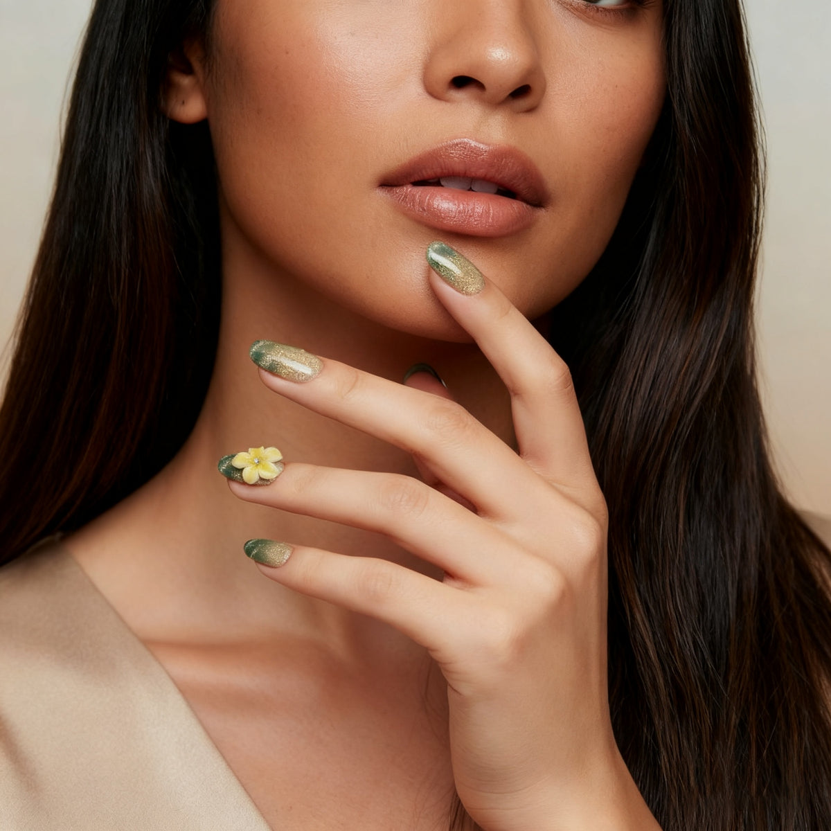 Golden shimmer waves meet soft green edges reminiscent of a serene lake, highlighted by a yellow flower. A refreshing manicure that captures nature's beauty.