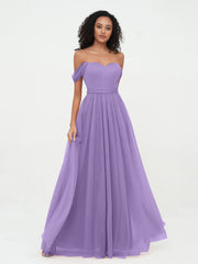 • Gustave features a shirred off the shoulder bodice with a sweetheart neckline for a universally flattering look. For a formal occasion, consider this long tulle bridesmaid dress that offers gorgeous textural contrast.