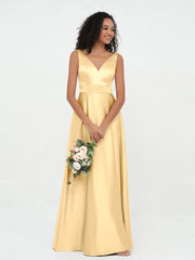 Princess V-neck Satin Max Dresses with Pockets-Gold