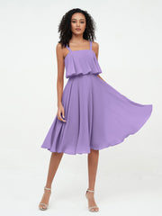 • The design of the neckline accentuates the collarbone with spaghetti straps and ruffled detail to provide support. The circle skirt falls just below the knee for a flowy and flirty romantic sweep.