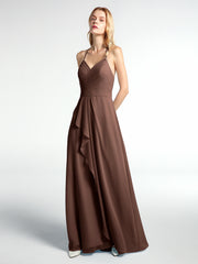 Spaghetti Strap Elegant Bridesmaid Dress with V-neck Chocolate