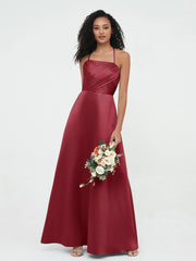 Spaghetti Straps Pleated Bodice Satin Gowns-Burgundy