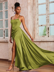 • The Honbria dress is a stunning blend of elegance and charm. Featuring spaghetti straps and a square neckline, this satin sheath gown showcases ruched details, a chic slit, and ribbon accents. The criss-cross lace-up back adds a unique flair, while the built-in bra ensures a comfortable and secure fit for any event.