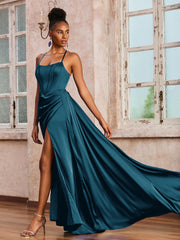 • The Honbria dress is a stunning blend of elegance and charm. Featuring spaghetti straps and a square neckline, this satin sheath gown showcases ruched details, a chic slit, and ribbon accents. The criss-cross lace-up back adds a unique flair, while the built-in bra ensures a comfortable and secure fit for any event.