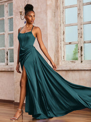 • The Honbria dress is a stunning blend of elegance and charm. Featuring spaghetti straps and a square neckline, this satin sheath gown showcases ruched details, a chic slit, and ribbon accents. The criss-cross lace-up back adds a unique flair, while the built-in bra ensures a comfortable and secure fit for any event.