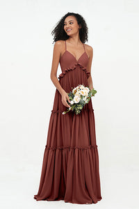 • Dinah is our floor-length modest bridesmaid dress made of chiffon with a scoop neckline with floating ruffles.