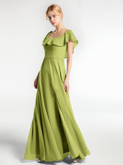 • Dinah is our floor-length modest bridesmaid dress made of chiffon with a scoop neckline with floating ruffles.