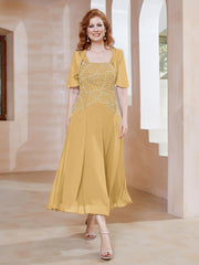 Square Neckline Beaded Chiffon A-line Dress Gold
