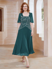 • Elevate your elegance in this Square Neckline Beaded Chiffon A-line Dress. The chic square neckline and tea-length design make it a sophisticated choice. Adorned with delicate beading, it combines style and grace for a refined look, perfect for various special occasions.