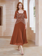 Square Neckline Beaded Chiffon A-line Dress Rust