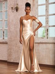 • The Fidelity dress combines classic glamour with modern allure. Its sweetheart neckline and strapless design create a striking silhouette, while the ruched stretch satin fabric enhances the mermaid shape. The backless design and sweep train add dramatic flair, and a built-in bra ensures a flawless fit.