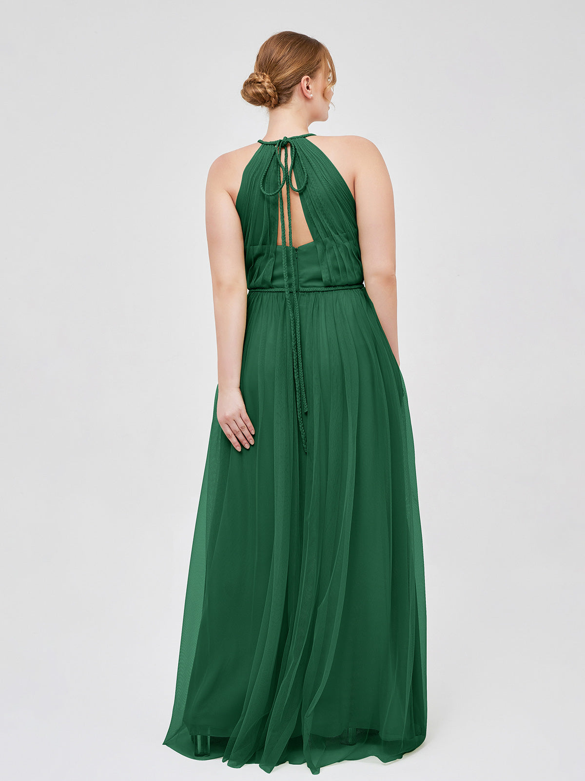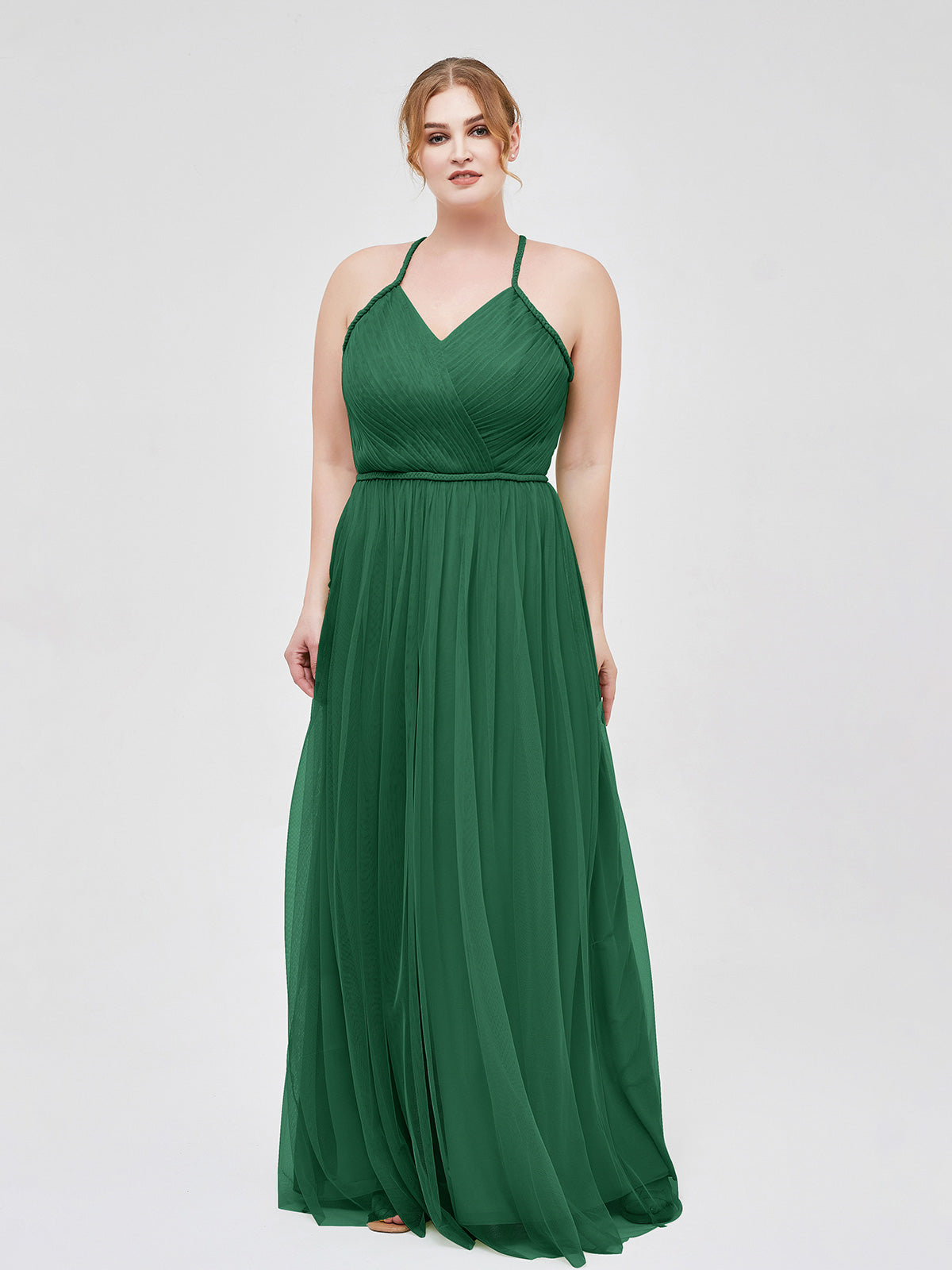 Twist Straps Tulle Maxi Dress with V Neckline Dark Green Plus Size
