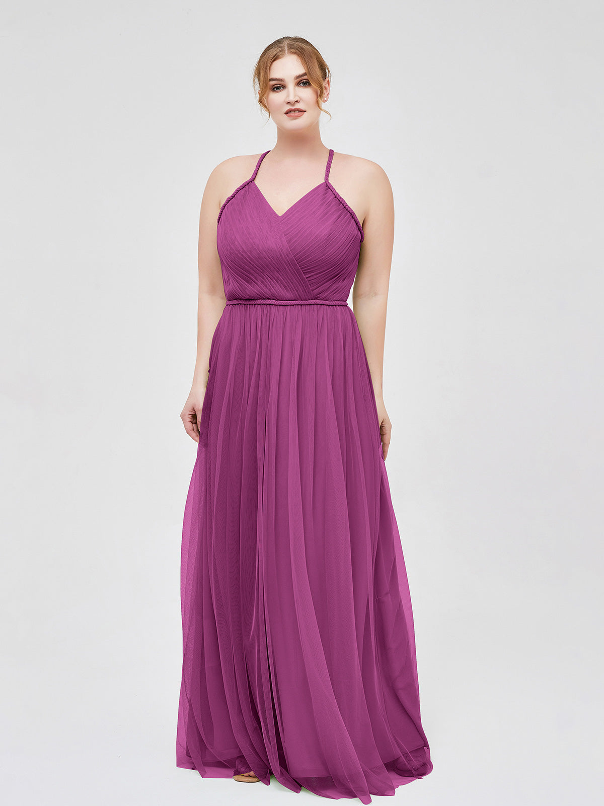 Twist Straps Tulle Maxi Dress with V Neckline Orchid Plus Size