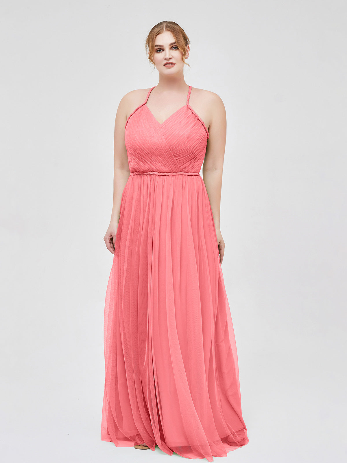 Twist Straps Tulle Maxi Dress with V Neckline Watermelon Plus Size
