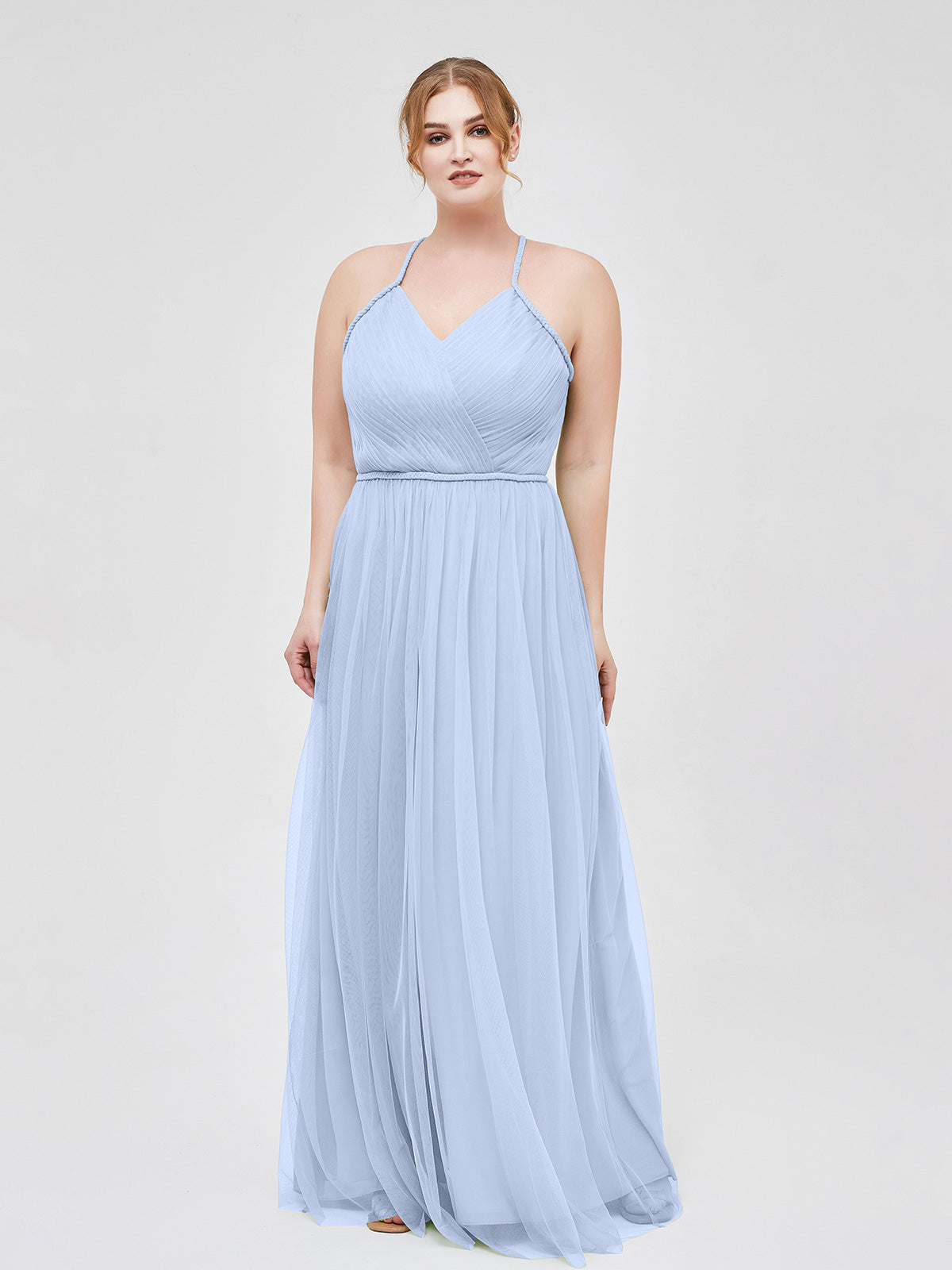 Twist Straps Tulle Maxi Dress with V Neckline Sky Blue