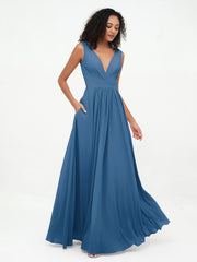 V-neck Chiffon Long Dresses with Pocktes-Ink Blue