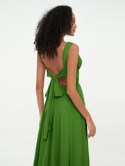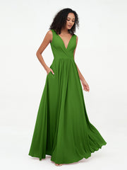 V-neck Chiffon Long Dresses with Pocktes-Moss