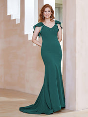 • Indulge in the allure of this Mermaid Gown with Flutter Sleeves. Crafted from stretch crepe, it features a dramatic sweep train and a flattering V-neckline. The gown is completed with a convenient zipper closure, making it perfect for those special occasions when you want to make a statement.