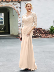 V-Neck Lace Top Half Sleeves Chiffon Dress Peach