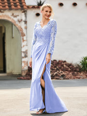 V-Neck Lace Top High Slit Pleated Dress Lavender