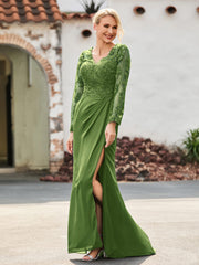 V-Neck Lace Top High Slit Pleated Dress Moss