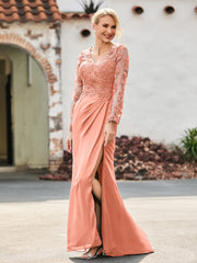 V-Neck Lace Top High Slit Pleated Dress Papaya