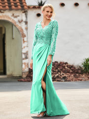 V-Neck Lace Top High Slit Pleated Dress Turquoise