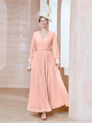 V-neck Long Sleeves Pleated Ruched Dress Coral
